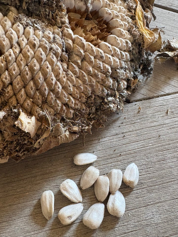 Also known as Tarahumara White, these beautiful flowers grow to 10' tall and golden heads are 8-10" in diameter with white and occasional gray-striped seed hulls. Sunflowers are one of the few plants domesticated in North America and were widely cultivated and used as food and medicine by many tribes. Great for pollinators and drought tolerant. Their deep root systems enables them to forage for water and nutrients and stabilize their big stalks. Direct sow. 90 days.