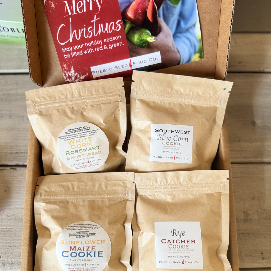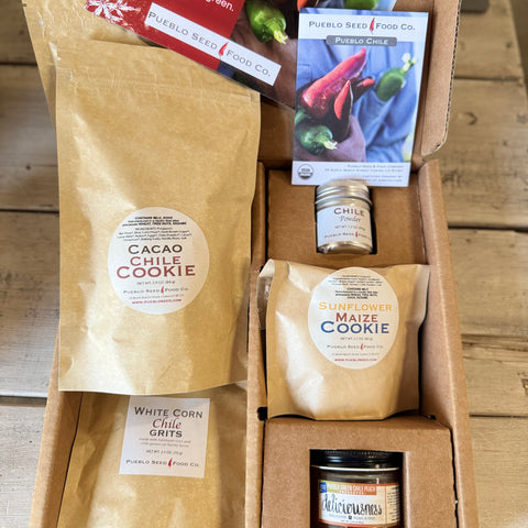 Chile & Grains Gift Box: This box includes 2 Chile Grits Sampler Packs (4 servings), 2 Cacao Chile Cookie packs (4 cookies), 1 Sunflower Maize Cookie Pack (2 cookies), 1 Chile Powder tin, 1 Chile Jam jar (made by Red Camper), and a Pueblo Chile Seed Packet. This box comes with a holiday greeting card in kraft box with chile image. Please let us know if you would like us to include a personalized message on the greeting card. Use the NOTES section in your order. All products are packaged in compostable kraft bags to hold your gift safe during shipping.